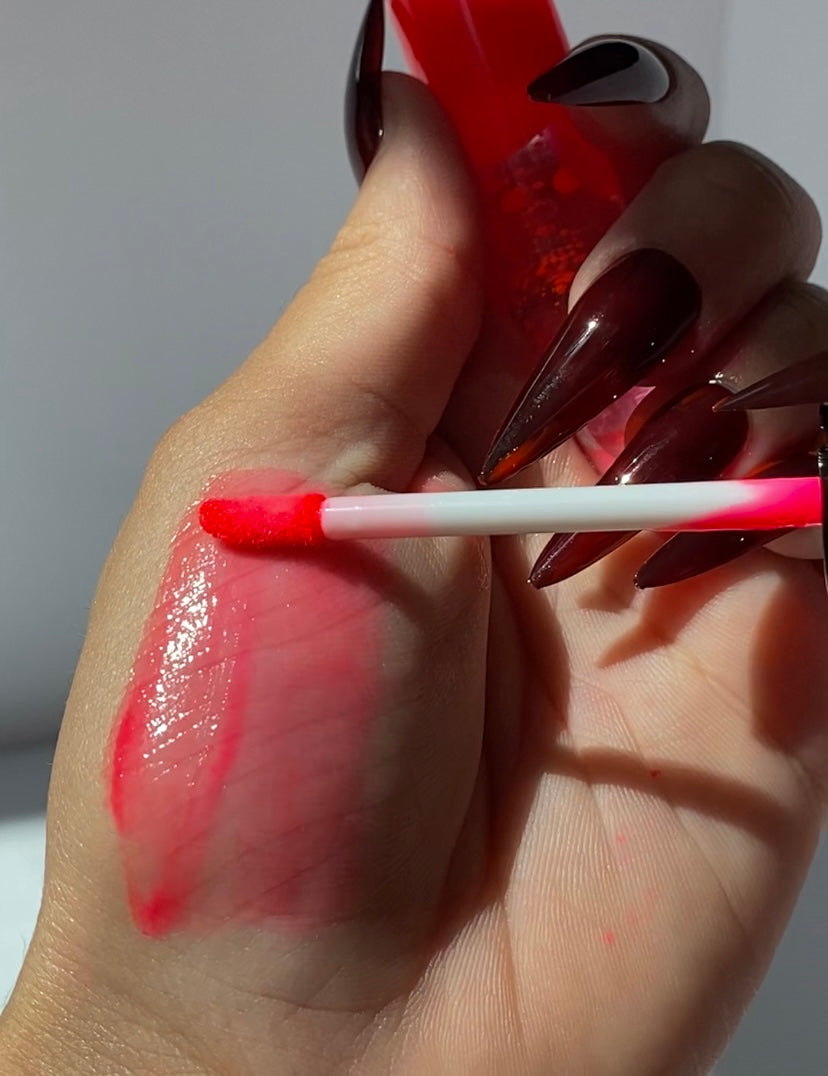 A hot pink lava effect lip oil that drips with attitude — playful on the outside, dangerous underneath. One swipe and they’ll never see you coming. This is BUBBLE GUM flavored.
